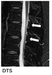 脊髄MRI(T2強調脂肪抑制矢状断)において、硬膜嚢背側の棘間部が弓状〜棘状の高信号を呈する場合がある。本所見は、横断像のFDSS〜iFDSSを矢状断として観察しているものであり、髄液漏出を示す所見と考えられる。