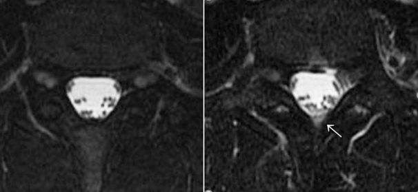 班研究症例検討において、CTミエログラフィー・RI脳槽シンチグラフィー検査前後の脊髄MRI所見を観察したところ、検査のために行った腰椎穿刺部付近に穿刺前に認めなかった水信号が、穿刺後に観察される症例が複数あった。