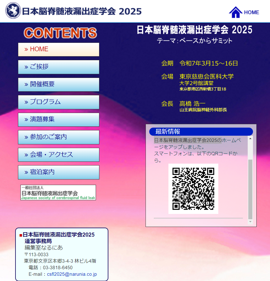 ・第4回日本脳脊髄液漏出症学会 学術集会 新規ウィンドウが開きます 2021.5.1日本脳脊髄液漏出症学会 設立 新着情報(学会よりお知らせ)日本脳脊髄液漏出症学会の第1回学術集会は、令和4年4月16・17日(土日)